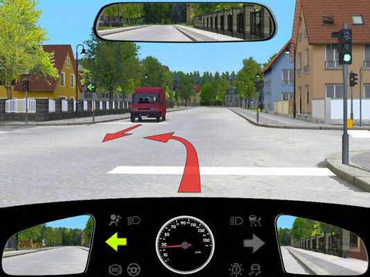 »Ein grüner Pfeil links hinter der Kreuzung zeigt an, dass der Gegenverkehr durch Rotlicht angehalten ist und dass Linksabbieger die Kreuzung in Richtung des grünen Pfeils ungehindert befahren und räumen können.«